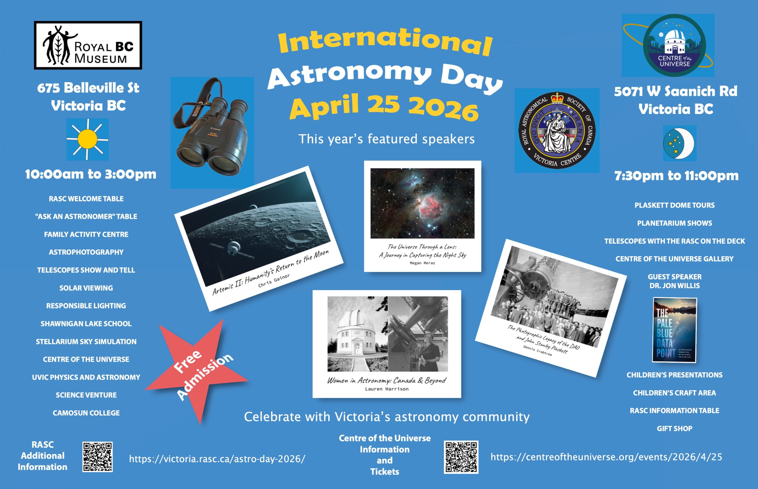 International Astronomy Day events for 2026 will take place Saturday April 25 at the Royal BC Museum (RBCM) from 10:00 a.m. to 3:00 p.m., and at the Dominion Astrophysical Observatory (DAO) and the Centre of the Universe from 7:30 p.m. to 11:00 p.m.